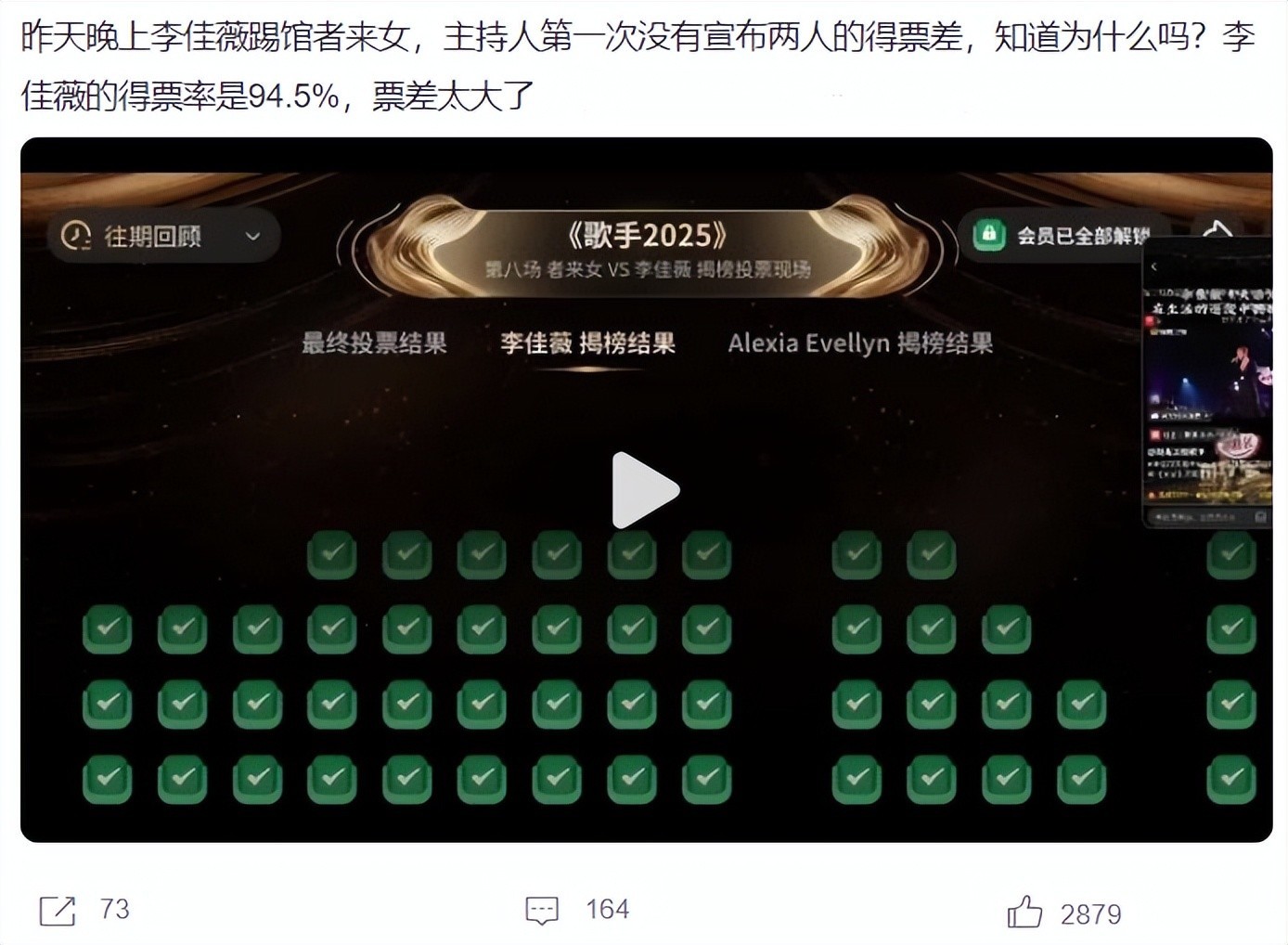 从目前的情况上看,李佳薇获得关注只是一时的,甚至有网友认为她参与录制《歌手2025》不会走太远,虽然在第八期节目中,李佳薇大放异彩,成功战胜者来女,得票率有94.5%,也就是说,487票,李佳薇得到460票。