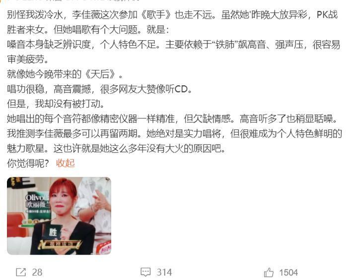 我们都知道,《歌手2025》的舞台不缺唱歌好的歌手,而是缺辨识度高的歌手,本季参与录制的歌手,林志炫、米奇、格瑞丝,更偏向于高音,相比于李佳薇,他们每个人都有属于自己的特色,而李佳薇会显得个人特色不足,她的唱功没有任何问题,但只依赖于“铁肺”飙高音,很容易造成观众审美疲劳。